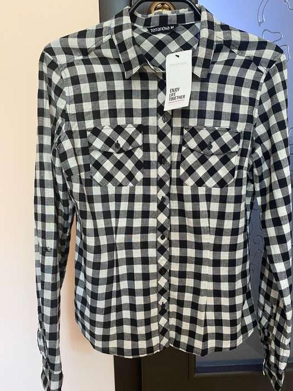 Женская рубашка Terranova, застегивающаяся на пуговицы. Есть два накладных кармана. 100% Хлопок Размер: М Ширина под рукавами – 46см. Длина – 62см. Длина рукава – 62см.