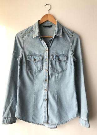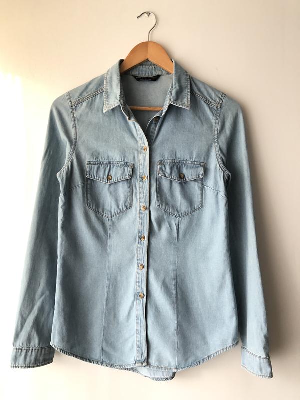 Джинсова бакитна сорочка Bershka в ідеальному стані на розмір XS. Дивіться по замірах: Загальна довжина-65см. НОГ-46 Плечі-38 Довжина рукава-63.НОТ-43. Склад - 100%коттон.