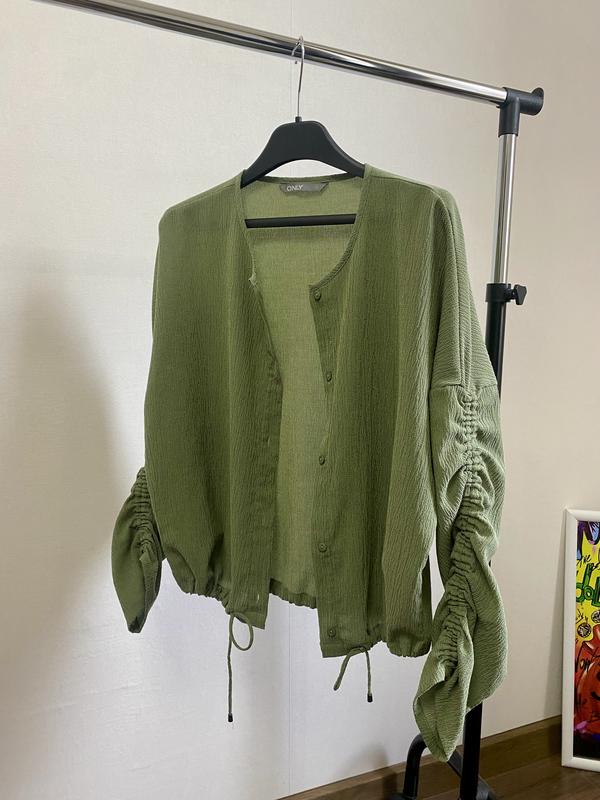 Укороченная рубашка с красивыми рукавами, приятный оливковый цвет. Указан размер S, но хорошо садится и на М.