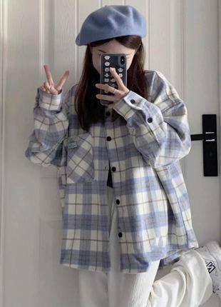 Тепла сорочка оверсайз блакитного кольору в трендову клітинку❤️ Утеплена сорочка - це відмінний вибір у будь-яку пору року🍁 Мод: 2474 Колір: блакитний Розмір: л, хл Матеріал: байка