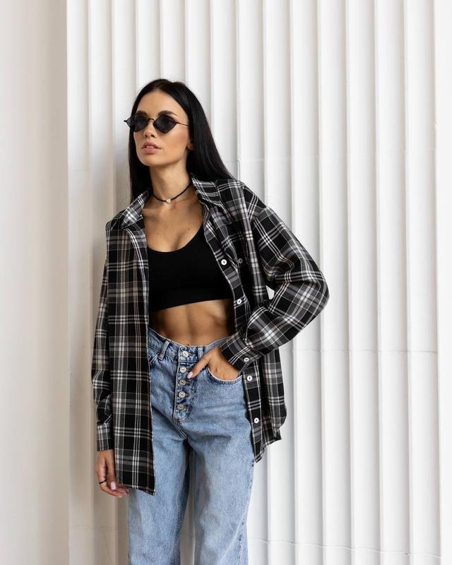 Женская черная рубашка из мягкой фланели шерстяная из шерсти в клетку длинная теплая с раз...