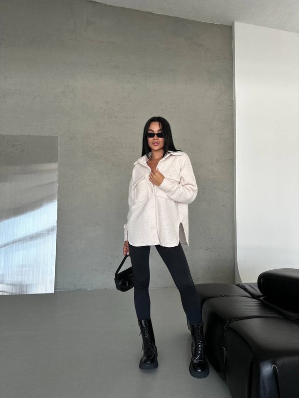 Сорочка Модель: 1457-056 Размер: универсальный Ткань: шерсть букле (барашок) - теплая, мягкая, с характерной текстурой Цвета: черный, серый, пудра, молочный Эта уютная рубашка из ткани букле отлично подойдет для прохладной погоды. Она обеспечивает комфорт и стильный вид, благодаря своей текстуре “барашок”. Универсальный размер позволяет ей адаптироваться под разные типы фигур.