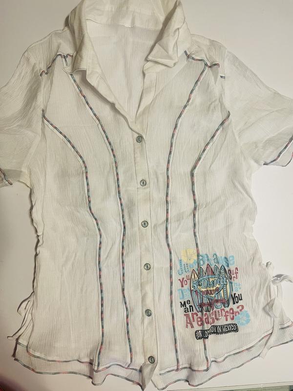 Сорочка жатка біла з кольоровими кантами та принтом. В бокових швах є затяжка на куліску. Заміри: ПОГ - 44 см. Довжина - 62 см. Рукав - 24 см.