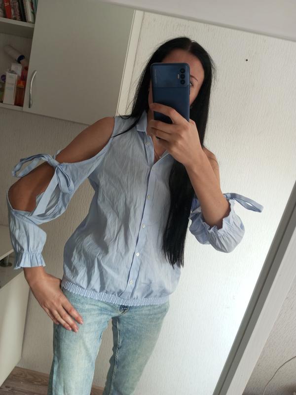 Стильная рубашка на резинке, оригинальные банты на рукавах пог 46 длина 61 плечи 31 талия 37 резинка тянется 52