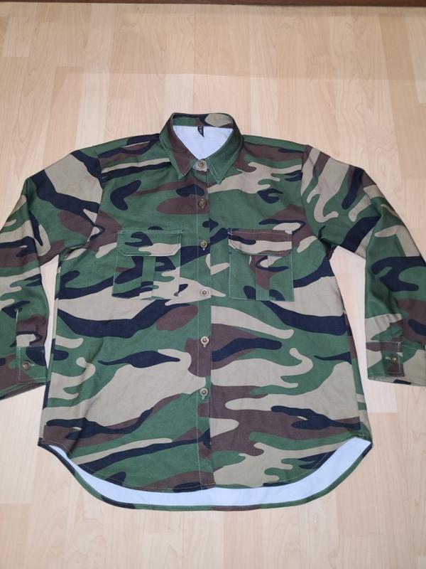 Рубашка на выпуск, с камуфляжным принтом, застежка на пуговицы, подойдет в качестве жакета ветровка. Замеры по желанию