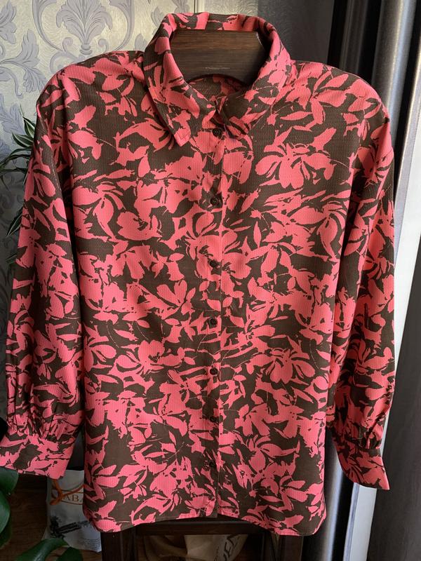 Рубашка прямого свободного кроя с удлиненным плечом, глубокой проймой и объемным рукавом на манжете. Абстрактный узор в котором гармонично соединились шоколадный и розовый цвета. Ткань натуральная, в составе вискоза. Указанный размер М, но благодаря крою, подойдет и на большие объемы. Вещь новая. Замеры: ширина в груди 122, в районе талии 126, рукав от горловины 74, длина 74/79.