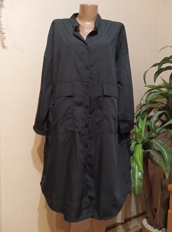 Нова, стильна рубашка. Зад на половину кружево. 80%-полиэстер, 20%-коттон ПОГ-67см ПОТ-70см ПОБ-70см ПО по низу -70см Длина спереди -97см Длина сзади -110см Длина рукава от шеи -63см