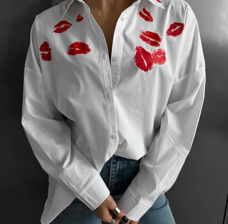 New🩶 2MOOD В наличии до Дня Влюбленные❤️ Сорочка💋 🔘Размеры - 42-46 универсал 🔘Цвета - белый 🔘Тканина - коттон 🔘Цена 679 грн🥥 Базовая универсальная рубашка на все события жизни. Модный акцент - поцелуи. Застегивается на пуговицы, немного удлиненная. Хорошее качество ткани. LADY