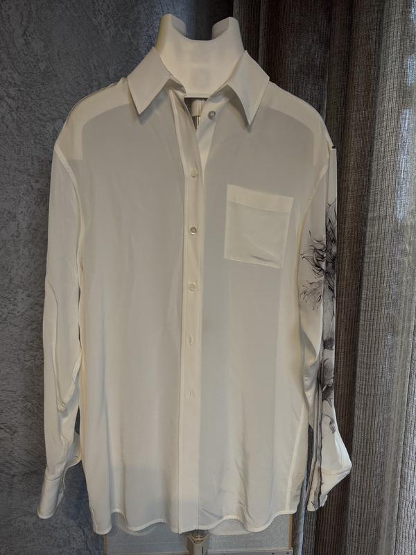 Стильная шелковая рубашка с рисунком на одном рукаве. Нежно-молочного цвета, удлиненная.