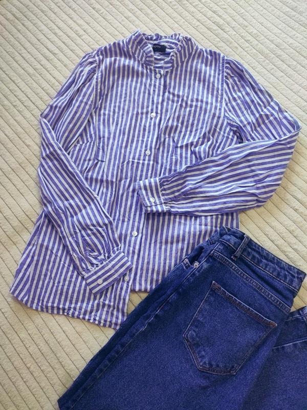 Красивая классическая рубашка с интересным воротником-стойкой и намеком на фонарики в плечиках. Прекрасно подходит для повседневных и деловых образов. Состояние идеальное. Размер 8/М. 100% Хлопок. Ткань приятна для теплого времени года, хорошо пропускает воздух. Достоверный цвет и вид ткани смотрите на последних 2-х фото.