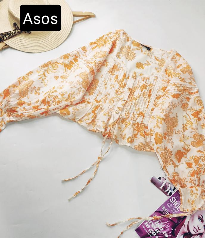 очень красивая женская рубашка/блуза белого цвета в оранжевый цветочный принт, рубашка с широкими объемными рукавами на завязках, рубашка на пуговицах, с рюшами, из натуральной ткани, состояние новой вещи без бумажной берки ❤️