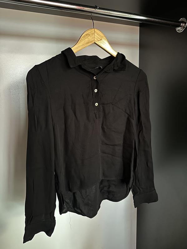 Стильна чорна сорочка з м’якої, легкої тканини. Має комірець, планку на ґудзиках та довгі рукави з манжетами. Вільний крій забезпечує комфорт та універсальність у поєднанні з різними образами. Ідеально підходить як для повсякденного носіння, так і для створення елегантного або casual-луку. Якщо потрібні додаткові фото або заміри – звертайтесь у повідомлення! Буду рада відповісти.