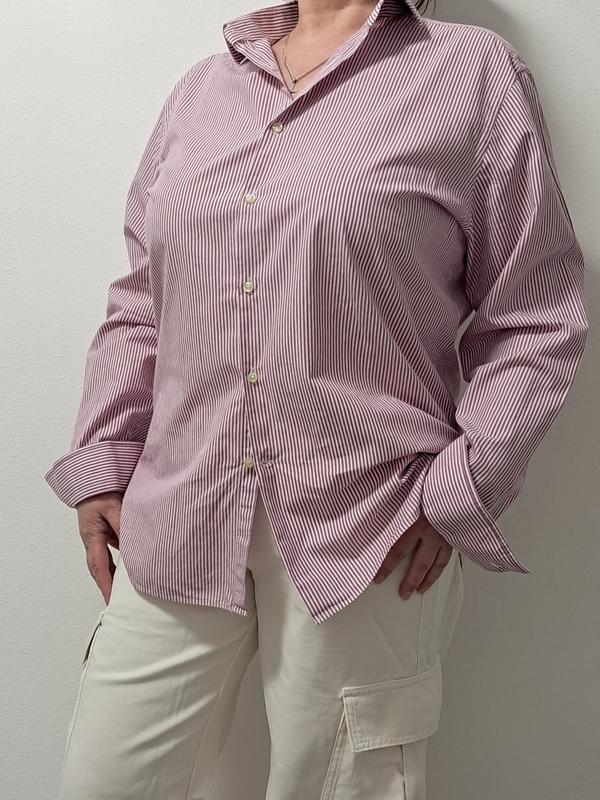 Базовая рубашка/рубашка белая в полоску фуксия, 100% хлопок, состояние очень хороший, свободный крой,объемные рукава с мужского плеча.Размер L, также можно на ХL, но лучше ориентироваться по замерам, Мои параметры и замеры рубашки смотрите ниже 👇 Все фото сделаны лично мной и на мне. Параметри сорочки: 1. ПО Плечей- 45см 2. ПО Грудей - 61см 3. Длина рубашки- 73см 4. Длина рукава (от плеча до края манжеты)- 63,5см 5. ПО Стегна - 58 см Мои параметры: Объем груди - 109 см Объем талии - 94 см Объем бедра - 106 см Руки (от плеча до запястья) - 56 см Рост - 161 см Безопасной оплатой отправки. Заходите ко мне в шкаф, продаю свои вещи, все только в идеальном или новом состоянии.