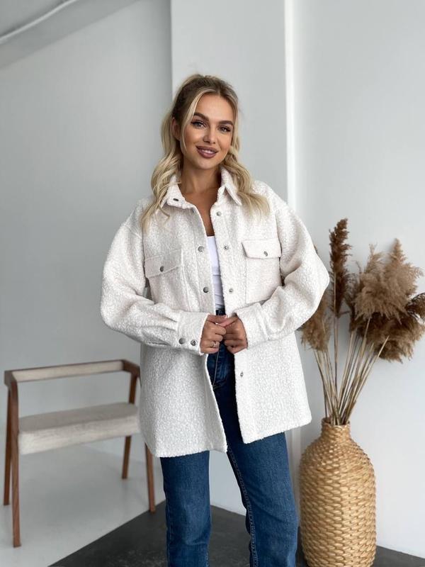 Куртка-сорочка арт. 1544 Материал: шерсть букле Размеры: 42-46; 48-52; Цвета: фуксия, розовый, зеленый, серый, черный, бежевый, молочный, кемэл