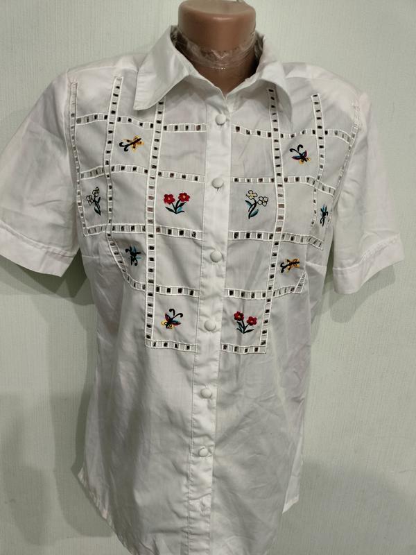 В идеальном состоянии рубашка на женщину 46-48р. Длина по спинке до низа 69см, ширина под подмышками 52см, длина ворота 41см.