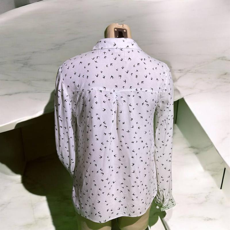 Белая рубашка с принтом в виде маленьких птичек в районе воротника завязки