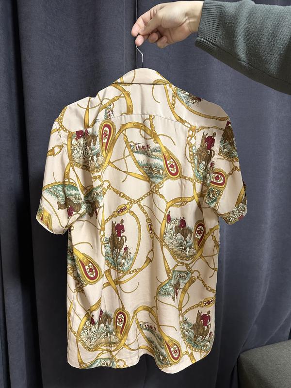 Рубашка, размер М по бирке, но сидит достаточно свободно, если нужно, могу сбросить дополнительные фото. Есть маленькие пятнышки, но их почти не заметно У меня на странице много вещей, по приятным ценам, потому что выполняю разбор гардероба