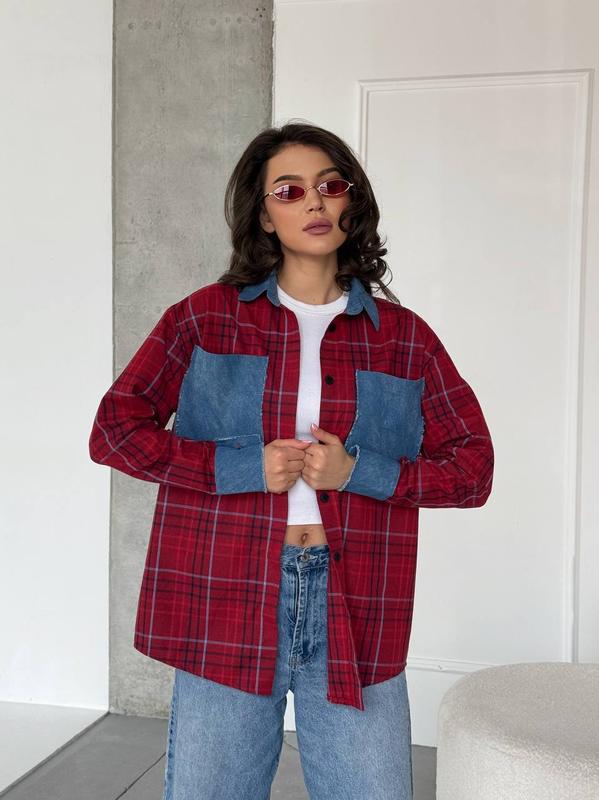Женская рубашка в клетку one size оверсайз с джинсовыми вставками красная