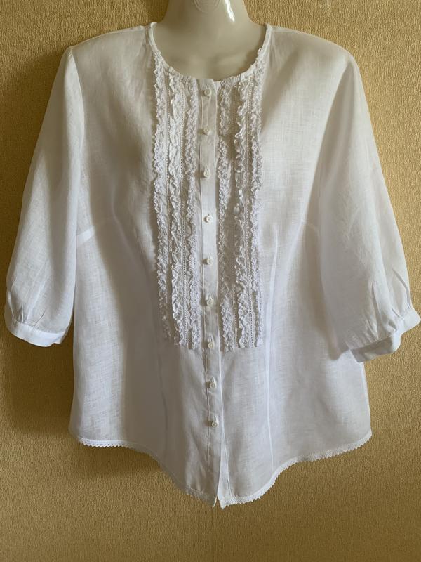 Добавьте изысканную основу к своему весеннему гардеробу с помощью белоснежной льняной рубашки Wallmann произведенной в Австрии. Сшита из хрустящего льна и имеет оборку спереди для элегантности . Состояние абсолютно новой вещи. Наличие запасной пуговицы. Размер по бирке 42, замеры: длина 66, ПОГ по выточкам на груди ( фото 7) - 52, плечи 40, плечо 12, рукав 3/4 - 37 см , низ 55 см закруглян и обработан прошвой ( фото 8) . Состав: 100% line 👍