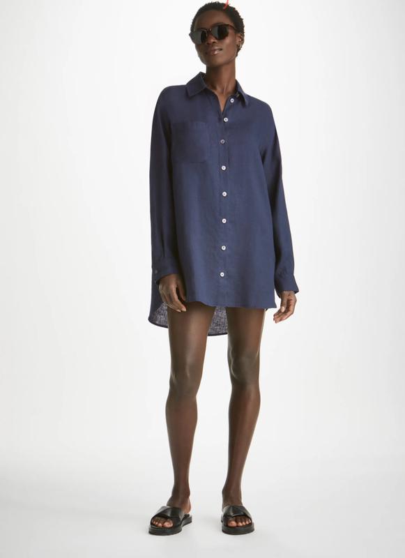 Шикарна сорочка з якісного 100% льону великого розміру від Open End Hamburg Germany Насичений колір navy темно-синій Розмір вказаний 54 ,на менший можна як сукню Плечі 51 спущені Пог 69 Довжина 92 До низу розширена Ґудзики перламутрові