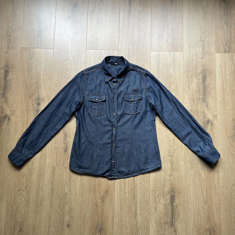 Приталенная рубашка, сзади и спереди. Под джинсовый стиль. Застежка на перламутровые кнопки.