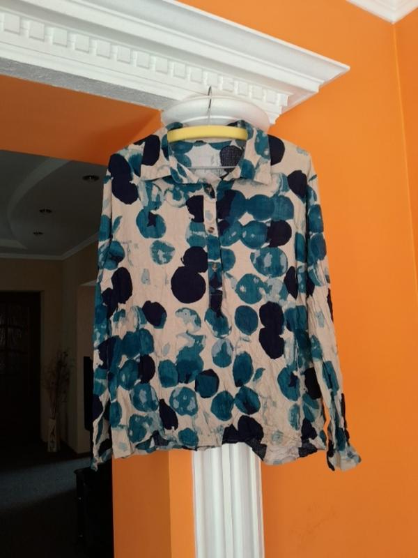 гарний стан,хоча на бірці пише полієстер,вона котонова або віскоза,бо сильно мнеться,ширина 57,довжина 64,плечі 45,трохи спущені,рукав 58