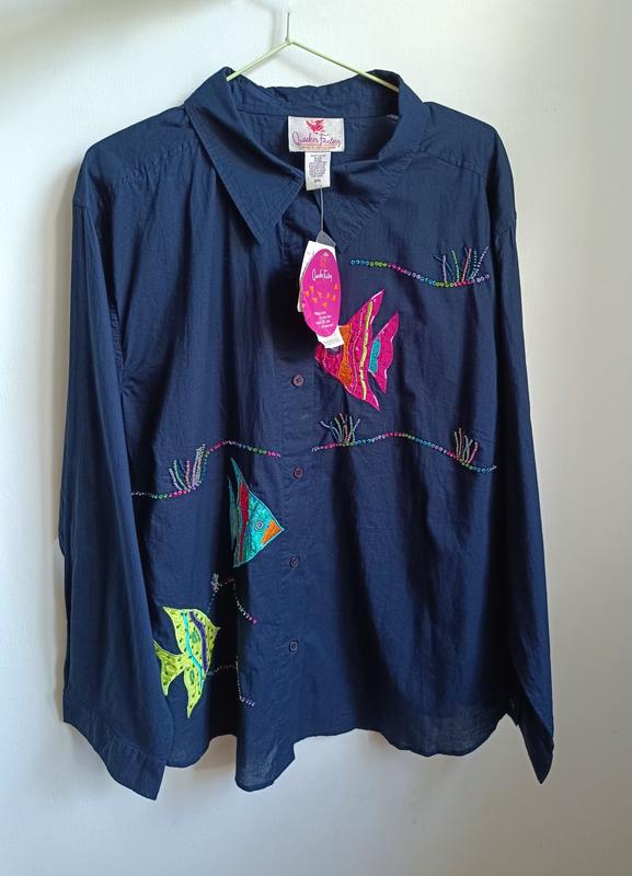 Вдохновленная дизайнеркой Жанной Бис, одежда #Quacker_Factory оживит ваш гардероб веселым образом. Игривые блестки, стразы, вышивка и блестящие детали создают красочную атмосферу и демонстрируют вашу креативную сторону. Материал: 100% хлопок Размер: 3XL - длина - 75см; - длина рукава - 61см; - ПОГ - 70см в максимально распространенном состоянии. ° запасную пуговицу