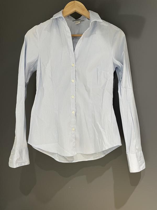 Блакитна сорочка в білу смужку. Приталена Довжина 61 Пог 43 Пот 37 Рукав від шиї 72