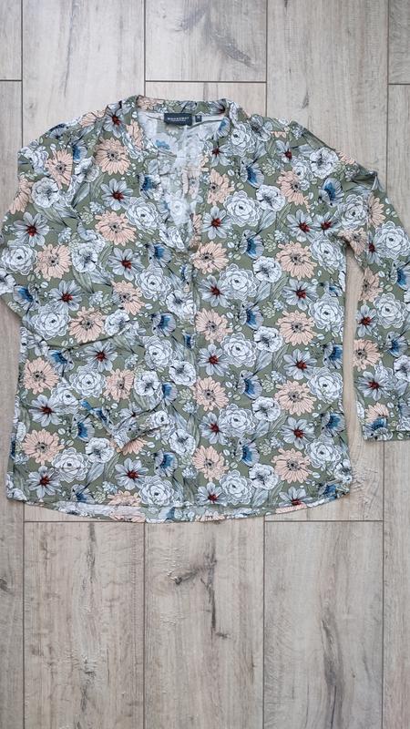 Очень легкая блуза. Длина по спине 68 см. Рукав на пуговицах, длина от плеча 59 см. Ширина под руками 54 см. Спереди 3 пуговицы, вырез 18 см.