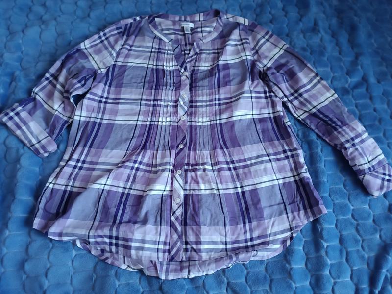 Легкая клетчатая рубашка блуза приятного фиолетово-сиреневого цвета привезена из США. Состояние новое но без бирки. Рукав может быть длинный может 3/4 (есть специальные хлястики для подгиба рукава). очень приятная надо так ткань. Замеры на фото