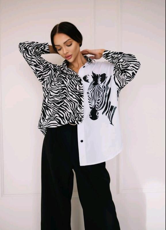 Сорочка Тканина : софт принт/софт Размер : единственный 42-46(на 48 также подходит) Цвет: принт зебри Хороший накат Замеры Длина по спинке - 76 см Рукав (спущенный) - 45 см Плече(спущене) - 30 см Объемы до 115-120 см