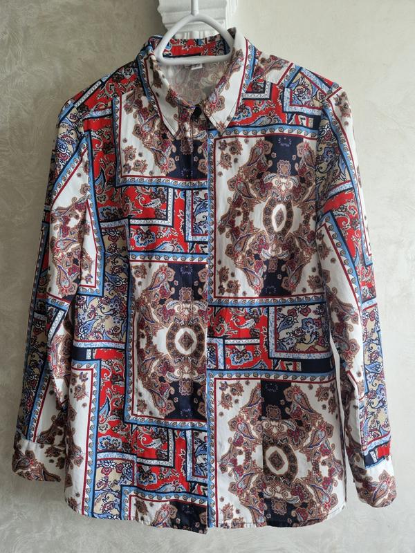 Яркая хлопковая рубашка от Alba Moda, в размере М-L Одетая на рост 165см, объем талии 76см, грудь 90см. Замеры: Плечи 41 Рукав 61 Подмышками 56 ПОТ 52 Длина 66 Отпрашиваю безопасной доставкой