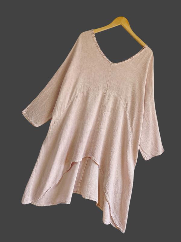 Рубашка из смесового льна Благородный пудровый цвет Горловина и вырез на спине оформлен кружевом в цвет Крой свободный. Подойдет от S до XL Пог 79 см Длина 79/88 см Рукав 59 см от горловины 40% лен 60% коттон