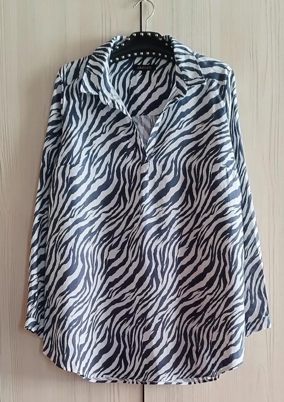 Удлиненная рубашка в принт зебра из 100% льна от Jaeger. Прямой свободный крой, воротник, v-образный вырез и длинные рукава.Закругленный подол. Размер 16/44 Склад : 100% льон Длина - 84 ПОГ - 57 Плечи - 44 Рукав - 64 Низ - 70