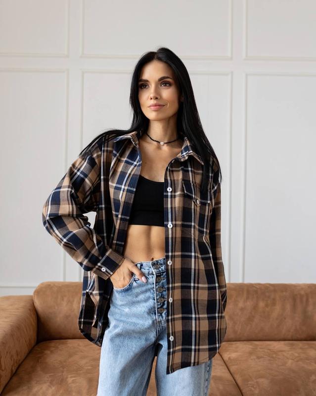 Жіноча сорочка рубашка коричнева синя в клітинку з шерсті та акрилу шерстяна акрилова дов...