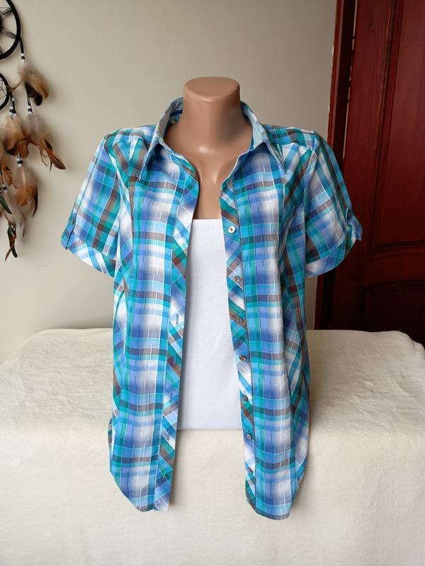 Стильная женская рубашка от бренда Canda. В состоянии новой вещи. Приталенного покроя, низ слегка скруглен. Ткань качественная, с 3D эффектом, приятная к телу, бирочка с составом и размером срезанная, на ощупь это хлопок с небольшим дополнением полиэстра. Подойдет на размер М/L. Пог 50, пот 45, по низу 57, плечи 39, рукав 21, длина по спине 65.