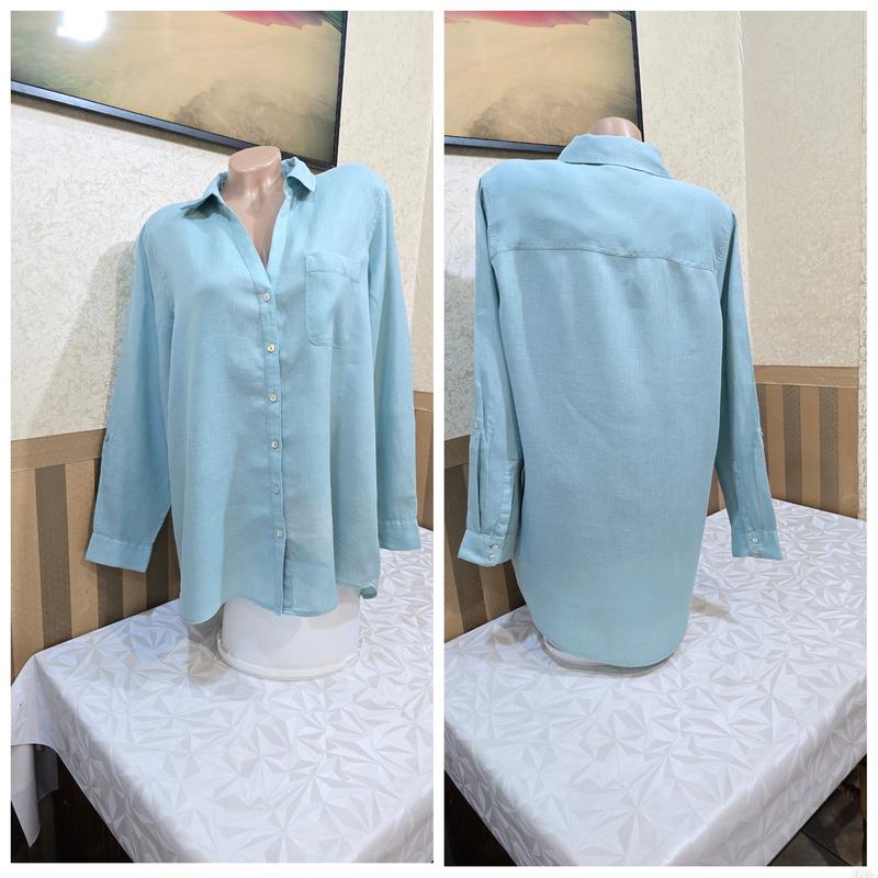 пог. 60. поб. 63. длина 73-80. рукав 61. бицепс 20. плечи 41. 100%Linen. p. L. состояние новой. но есть нюанс спереди снизу света ткань.
