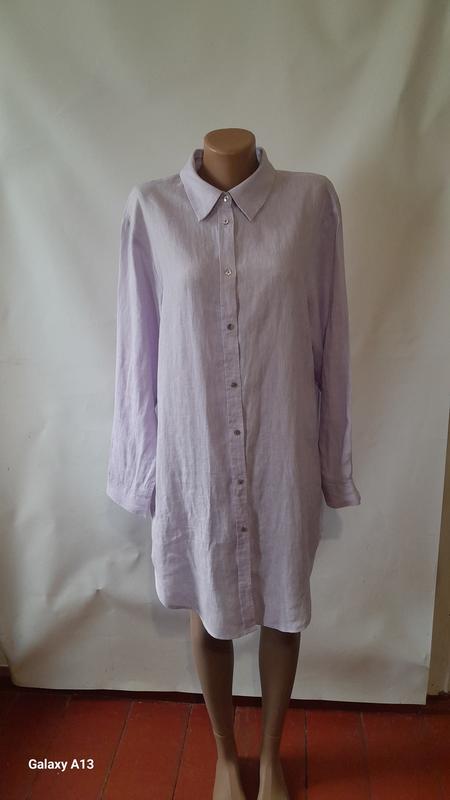 Новая с бумажной этикеткой. 100% лен Свободный прямой крой. Цвет светло сиреневый. Перламутровые пуговицы. Длина 91 см грудь ширина 54 см бедра 57 см низ 61 см рукав 58 см