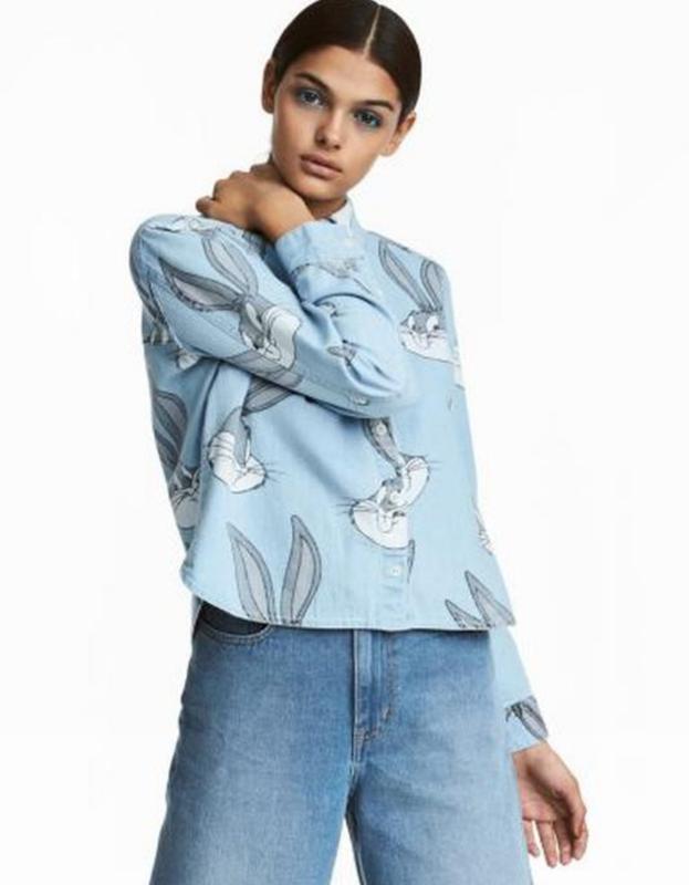 Стильная, укороченная рубашка из выстиранного денима, с набивным рисунком, с длинными рукавами, свободного кроя. Плечи 40, ПІГ 54, ПИТ 55, рукав 58, длина изделия 56. Бирка со складом срезанная.