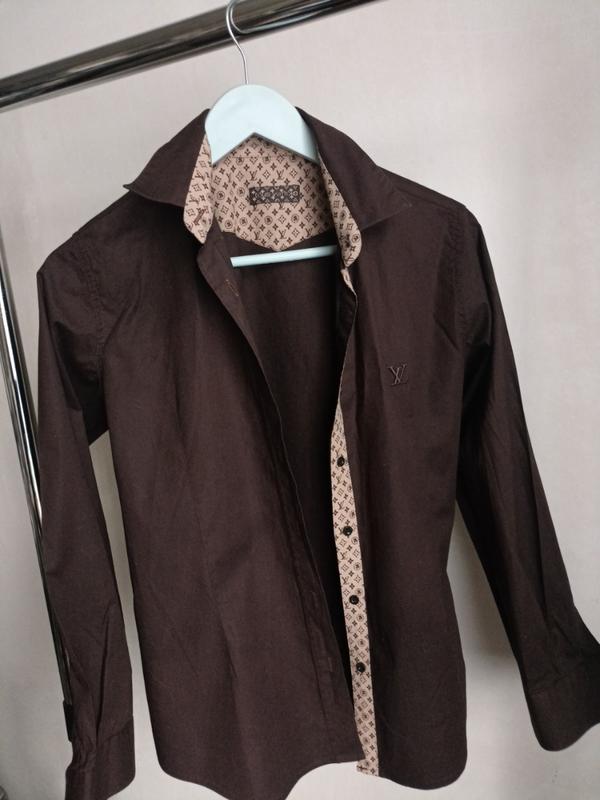 Рубашка Louis Vuitton шоколад, коттон+эластан, приталенная, размер s-m, ПОГ 48, ПОТ 42, по низу полуобхват 48, длина 64, рукав 55, бицепс 16,плечи 38. В идеальном состоянии