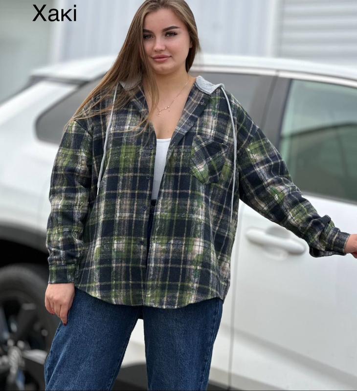 Женская фланелевая рубашка свободного кроя с капюшоном в клетку.
