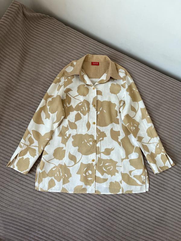 Бежева лляна сорочка на гудзиках вільного прямого крою. Є розрізи з боків та на манжетах рукавів. Нова, без бірки. Дуже якісна. Склад: 100% льон. Заміри: Довжина по спині (по центру) 74см, спереду (по центру) 71см Довжина рукава від горловини 73см Пог 59см Пот 53см
