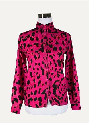 Яркая блуза цвета фуксии, в леопардовый принт, крой прямой. Ткань матовая, без блеска. Состояние новой вещи. Ткань полиэстер. Размер 12 ( M-L). Длина 65, пог. 50, пот. 50, плечи 40, рукав 60.
