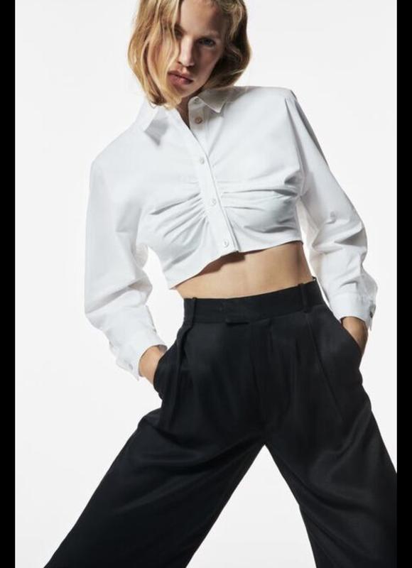 Вкорочена сорочка ZARA, розмір S Стильна вкорочена сорочка від ZARA — трендовий елемент гардероба ✨ Модель з оригінальними зборками спереду, що красиво підкреслюють фігуру та талію. Класичний комір і довгі рукави додають елегантності, а кроп-довжина робить образ сучасним і сміливим. 🔹 Колір: білий 🔹 Розмір на бірці: S 🔹 Фасон: вкорочений, приталений 🔹 🔹 Бренд: ZARA Чудово поєднується з брюками з високою посадкою, джинсами або спідницею. Підійде як для стильних повсякденних образів, так і для виходу