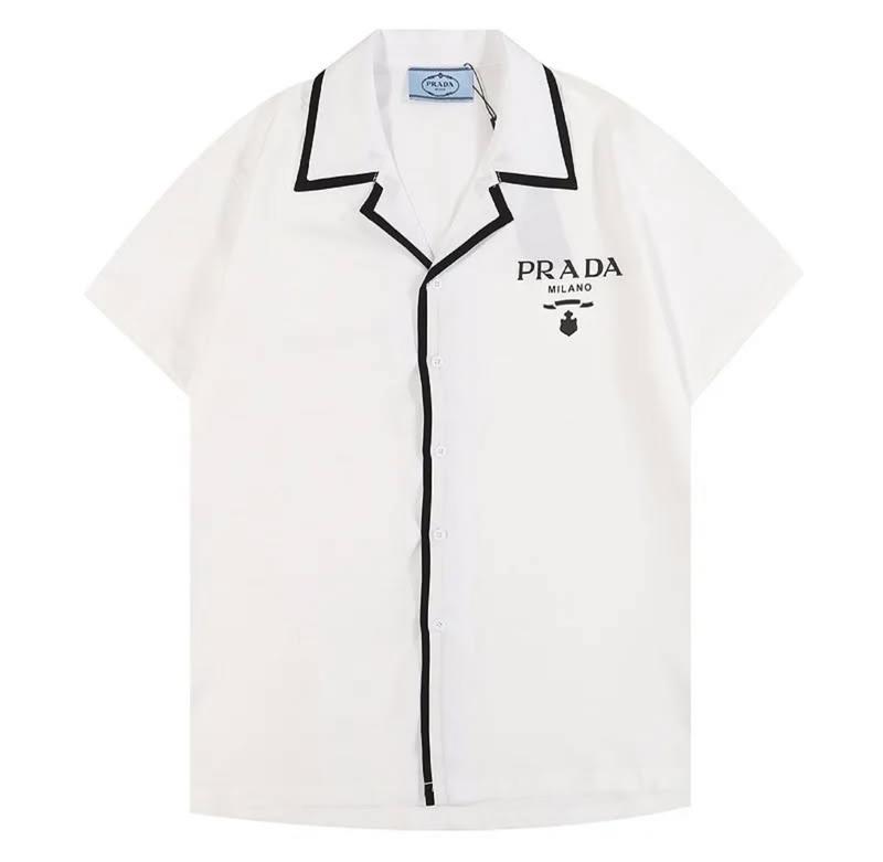 Нова сорочка від легендарного італійського дому PRADA — втілення мінімалістичної елегантності та бездоганної якості. • Марка: PRADA • Колір: білий з чорною контрастною обробкою • Стан: нова • Матеріал: 100% бавовна • Виробництво: Європа Особливості дизайну: • Прострочений логотип PRADA Milano на грудях • Комір-боулінг з контрастною чорною окантовкою • Короткі рукави • Застібка на ґудзики спереду • Контрастна чорна обробка по всіх краях Класичний крій поєднується з сучасними деталями, створюючи універсальну річ для будь-якого гардеробу. Натуральна бавовна забезпечує комфорт і довговічність.