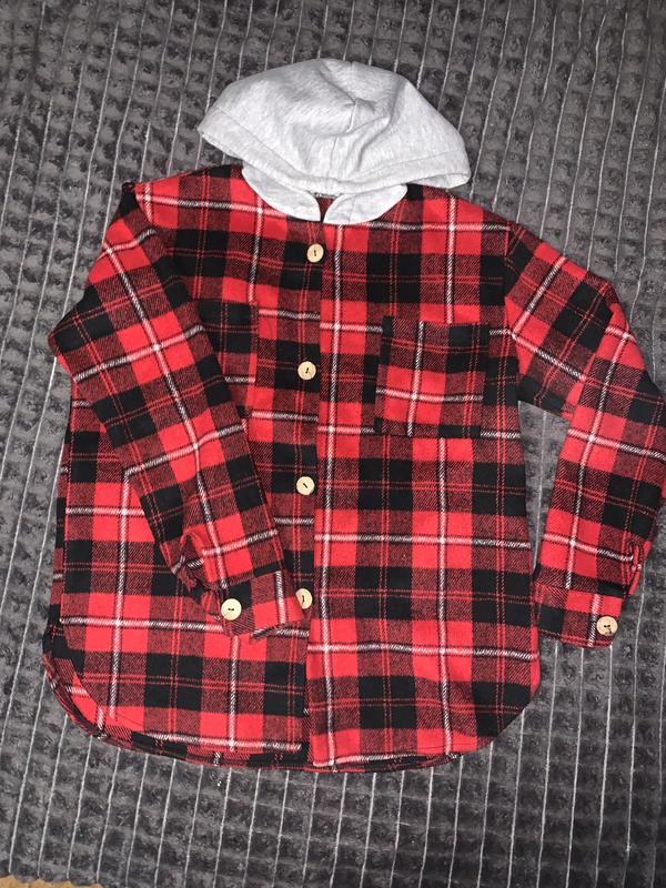 Тепла жіноча сорочка в червоно-чорною клітинку з сірим капюшоном. Модель на ґудзиках, що забезпечує зручне та швидке застібання. М’яка та приємна до тіла тканина дарує тепло у прохолодну погоду. Сорочка має сучасний та стильний вигляд, підходить для повсякденного носіння. Стан відмінний.