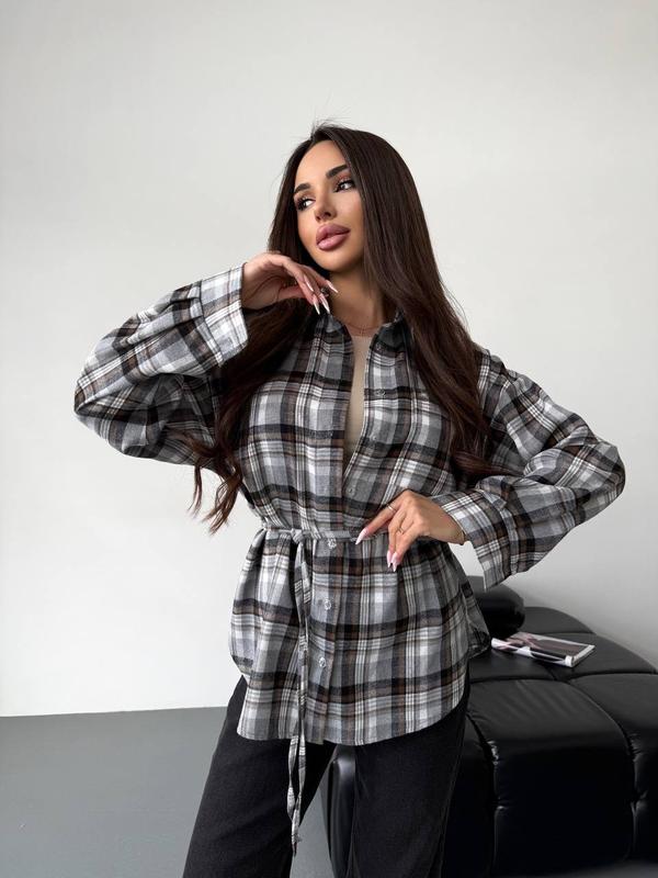 ⚪️НОВИНКА⚪️ Універсальна сорочка 2 в 1 🤍 Модель 868 Трендова сорочка в клітинку вільного крою — база, яка працює на різні образи ✨ 💫 Її можна носити: — вільно oversize для розслабленого casual образу — під пояс, підкреслюючи талію та створюючи більш жіночний силует Пояс входить у комплект — можна змінювати настрій образу за секунду. Тканина - турецька сорочкова фланель - м’яка, комфортна та приємна до тіла. Спущена лінія плеча додає стильного об’єму. Розмір - універсал (42-48) ▪️ОГ - до 118-120 см ▪️Довжина - 73 см ▪️Довжина рукава від горловини - 73 см ✨Фото та відео РЕАЛ