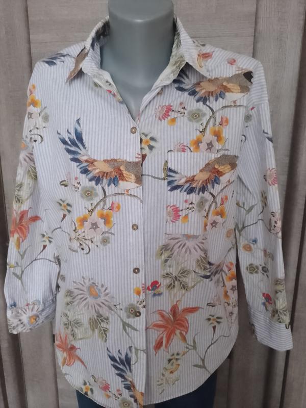 Котон, красиво подходит опущенная и захлопнущая в джинсы, удобная модель,гламурный принт, покупка на М, снизу нет одной пуговицы, но можно убрать сверху от воротничка,вин там ненужный,