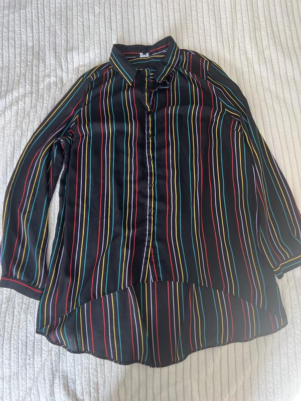 Сорочка в ідеальному стані, зад подовжений. Загальна довжина заду 86 сантиметрів, загальна довжина спереду 66 сантиметрів, плечі 45 сантиметрів, Довжина рукава від плеча 64 сантиметри, На пів обхват грудей 62 сантиметри. Тканина 100 відсотків Поліестер. Розмір XL-XXL Що відповідає 52-у 54-у Розміру