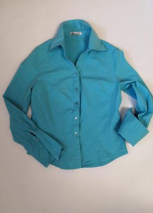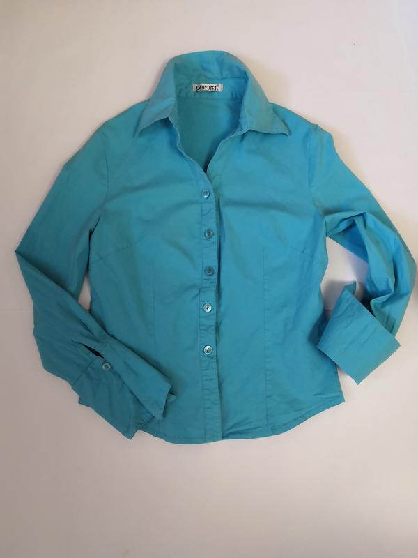 Рубашка Ledy Mel, размер Л. Замеры: длина по спинке 53 см, длина по боковому шву от рукава 44,5 см; плечи 35 см, полуобхват груди 40 см, полуобхват талии 36 см, полуобхват снизу 41 см; длина рукава от плеча 57 см (манжет 13,5 см). Ткань приятная к телу, эластична, немного тянется (в составе 10% спандекс). Рубашка голубого цвета, имеет привлекательный внешний вид.